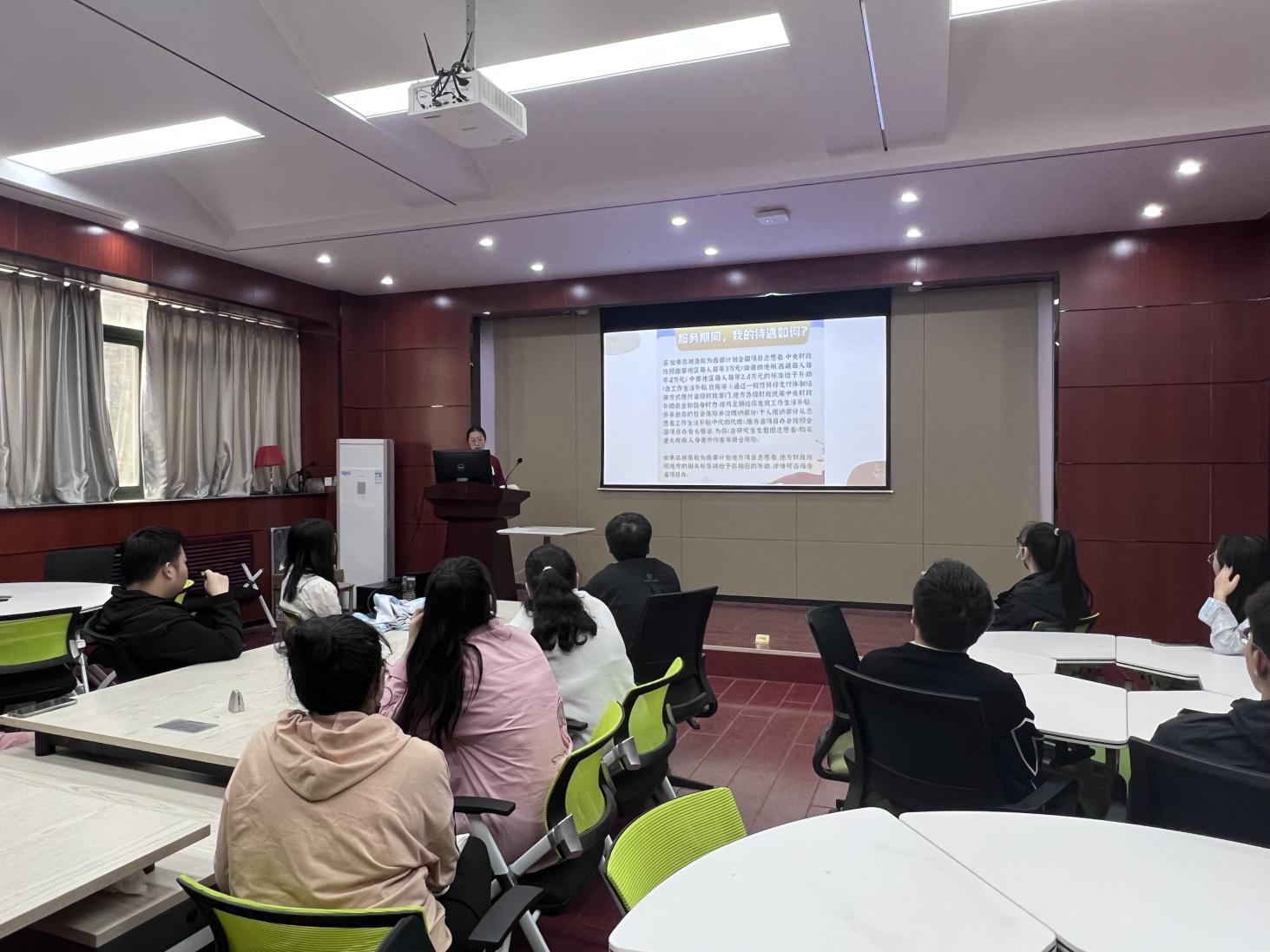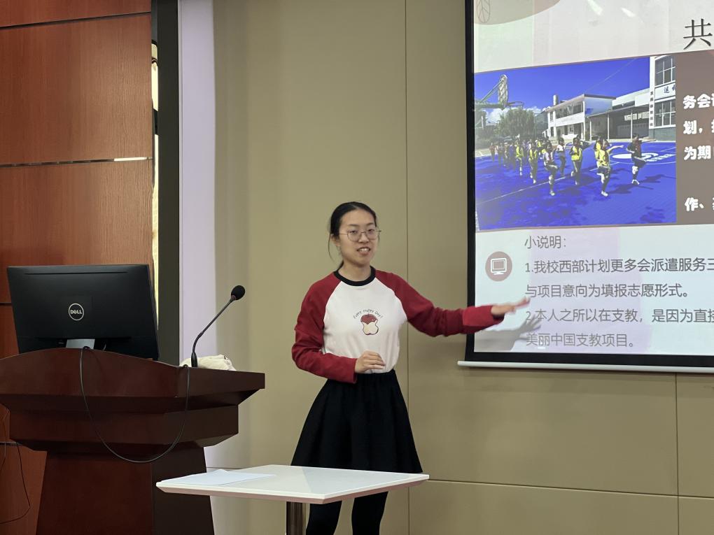 分享会上,孙雨瑶学姐首先就西部计划的七个专项服务、招募流程、服务岗位、服务时长和优惠政策等内容进行了全面详细的介绍,鼓励大家扎根基层地区,锤炼意志品格。随后,孙雨瑶学姐利用视频和图片等形式,多角度展现了自己两年来服务西部地区的工作经历,朴素真挚地讲述了自己踏实工作,强化自我认知,锻炼实践能力的收获与感悟,让同学们进一步认识到投身西部基层服务的重要意义。