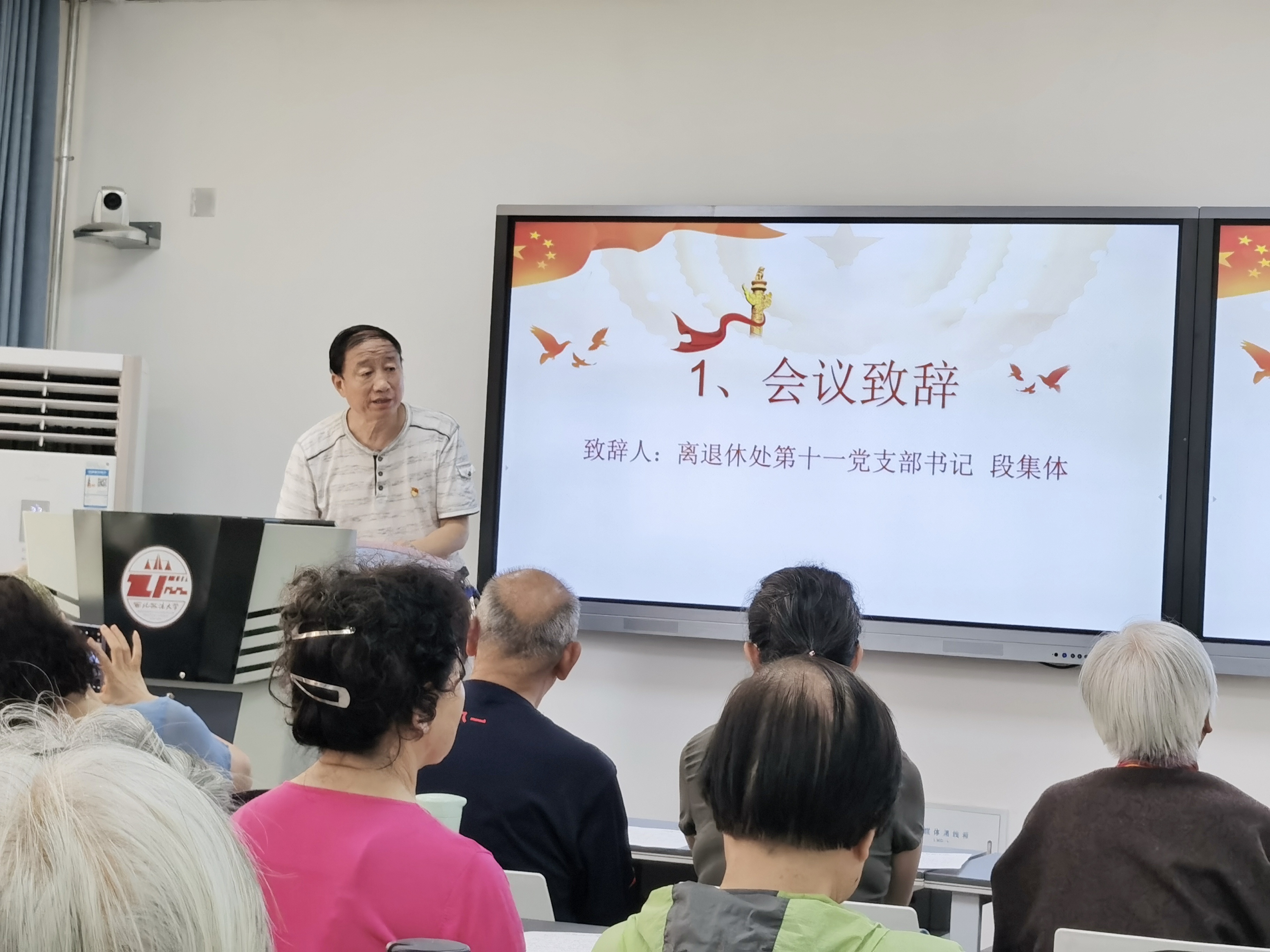 会议伊始,离退处第十一党支部书记段集体上台致辞。他谈到,本次联谊活动在“七一”建党节前夕,让退休老教师与学生欢聚一起,希望能加强沟通、增进情谊,学习回顾党的百年风雨历程和光辉历史,表达了我们对中国共产党的热爱与祝福,传承红色基因、坚定理想信念,进一步推动党史学习教育入脑入心。