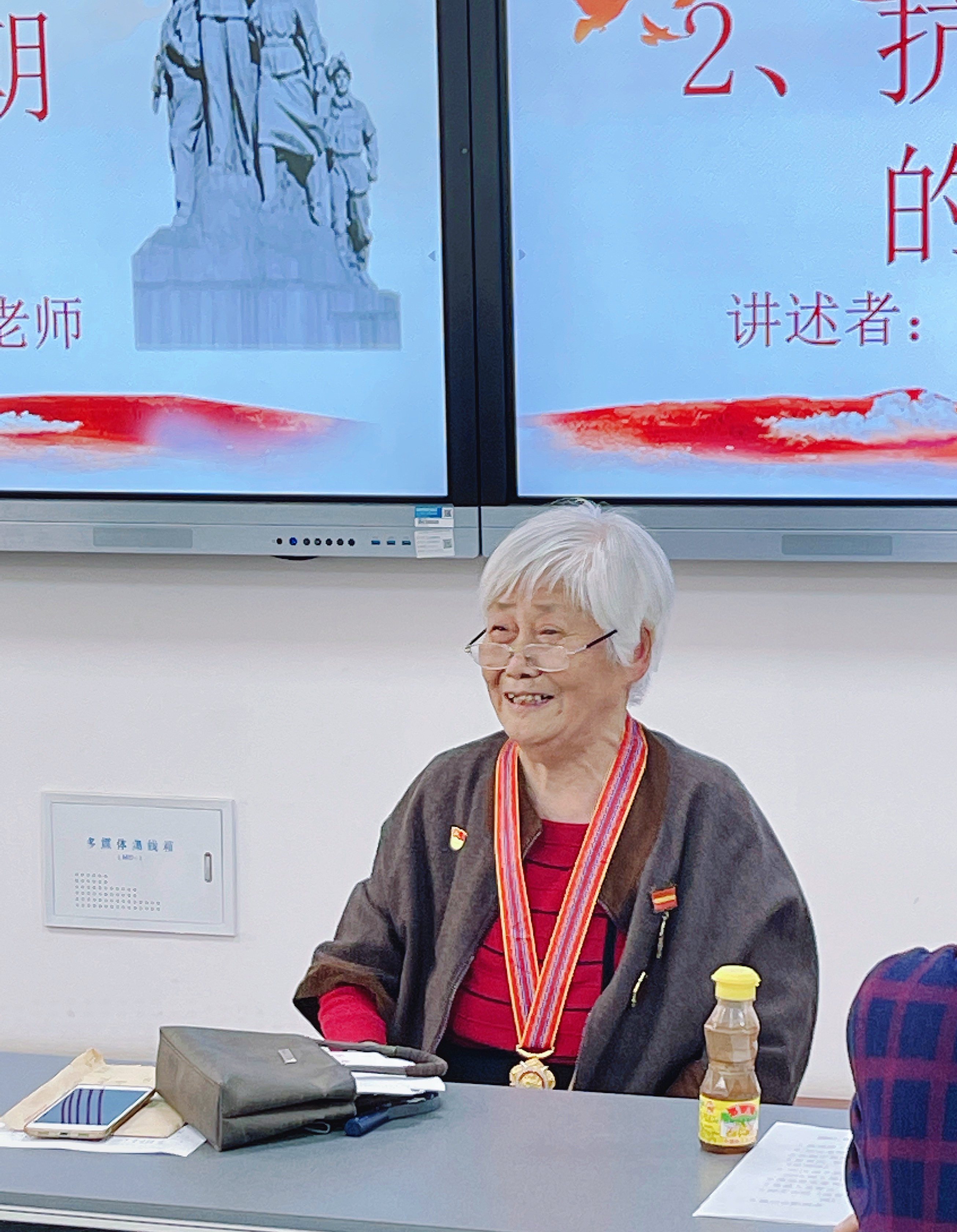 首先,离退处刘云老师为大家讲述抗美援朝的故事。作为参加过抗美援朝战争的老战士,他以朴素生动的语言、慷慨激昂的陈述、真挚动人的情感为大家分享了从应征入伍到参加抗美援朝战争再到凯旋回国的全过程,娓娓道来她与战友刘逵的故事。聆听的同学时而振奋时而感动,深刻感受到了志愿军战士生活条件的艰苦、行军途中枪林弹雨的危险以及战士们保家卫国的决心。