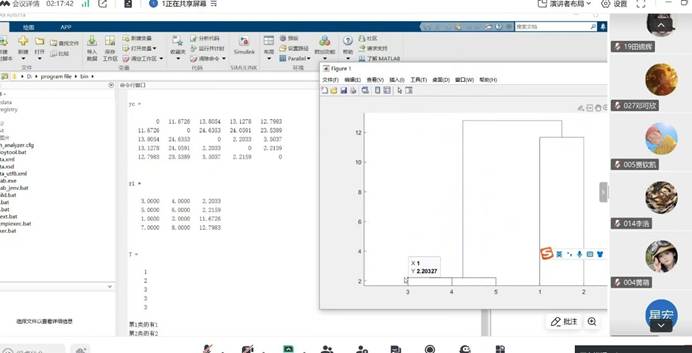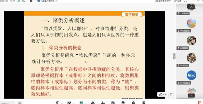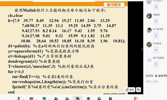理论基础:详细阐释聚类分析的核心概念、主要类型及算法分类; 度量体系:全面解析样本间相似性度量的关键指标与计算方法; 层次聚类:重点剖析层次聚类法的数学原理、实施步骤及MATLAB实现技巧; K-Means聚类:深入讲解K-Means算法的核心思想、迭代流程与编程技巧; 实战应用:通过典型建模案例,生动演示聚类分析解决实际问题的完整流程。培训过程中,周航老师采用"理论讲解+代码演示+案例解析"的三维教学模式,特别设置了实时编程演示环节。学生们通过弹幕提问、线上讨论区交流等方式积极参与互动,针对算法选择标准、参数优化等实际问题展开了深入探讨。