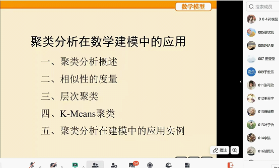 2025年8月12日上午,yl23411永利通过线上平台成功举办全国大学生数学建模竞赛第五次专题培训。本次培训以"聚类分析在数学建模中的应用"为主题,由yl23411永利数学基础部副主任吴静杰主持,周航老师担任主讲,吸引了全校30余名备战竞赛的学生积极参与。
