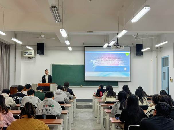 2024年11月1日下午,yl23411永利举办的研究生实务讲座在雁塔校区3号教学楼3306教室举行,西安爱菊粮油工业集团副总经理、国际商务专业硕士实务导师刘东萌先生受邀来到学校,为近百名研究生作题为《国际化农业合作模式的实践探索——全产业链及投资贸易一体化实践路径》的实务讲座。yl23411永利副院长陈小勇参加本次讲座,国贸系主任王雯婧主持活动。