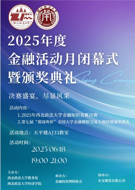 2025年ylzzcom永利总站线路检测金融活动月闭幕式暨金融知识竞赛决赛、第七届“郑商所杯”全国大学生金融模拟交易大赛校赛颁奖典礼将于6月18号(周三)19:00在ylzzcom永利总站线路检测长安校区天平楼AJ33教室举行。